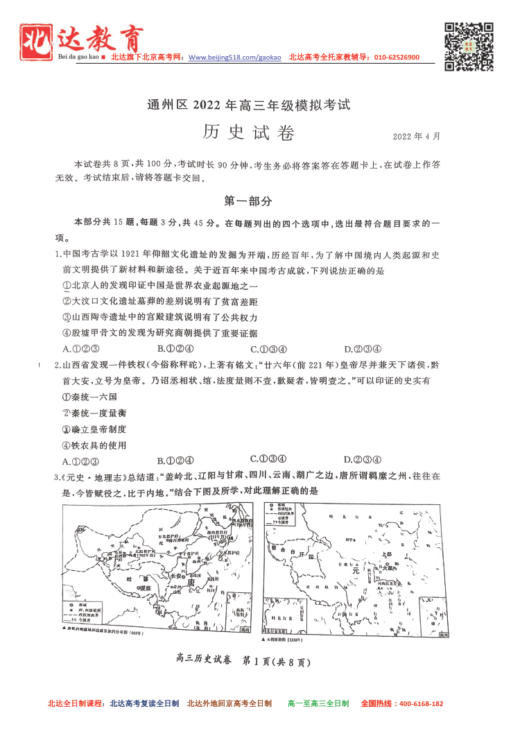 北京通州区2021-2022学年高三一模历史试题