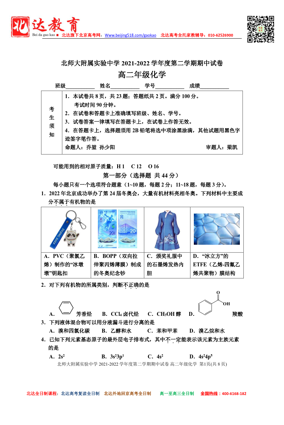 北京北师大附属实验中学2022年高二二期中考试化学科目考试已结束,北京admw360教研组为大家整理了化学试题及答案,分享给各位小伙伴。