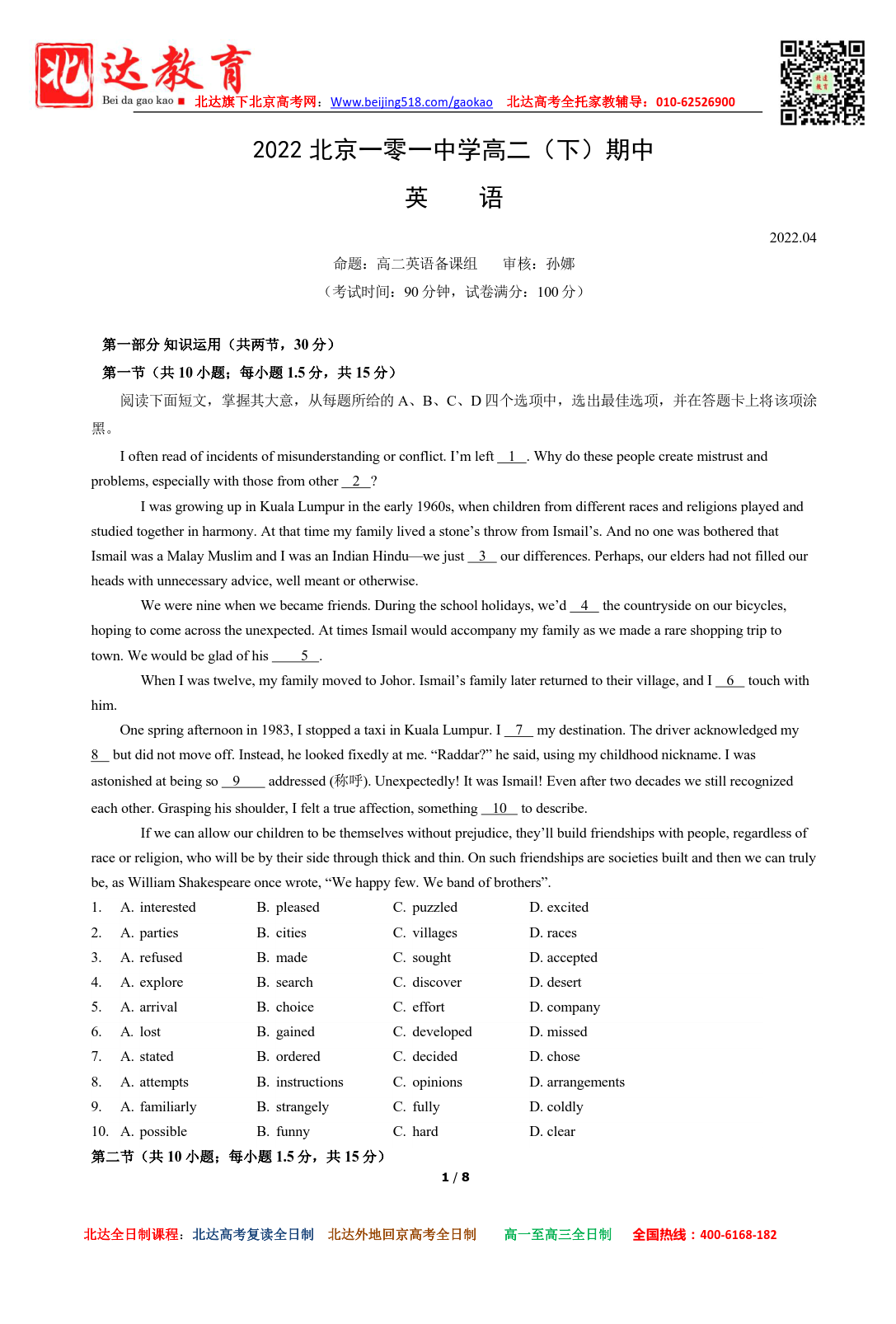 北京101中学2022年高二年级期中考试英语科目考试已结束,北京admw360教研组为大家整理了英语试题及答案,分享给各位小伙伴。
