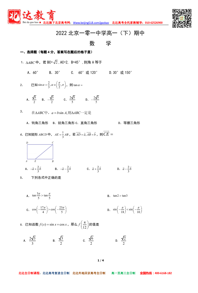 北京101中学2022年高一年级期中考试数学科目考试已结束,北京admw360教研组为大家整理了数学试题及答案,分享给各位小伙伴。
