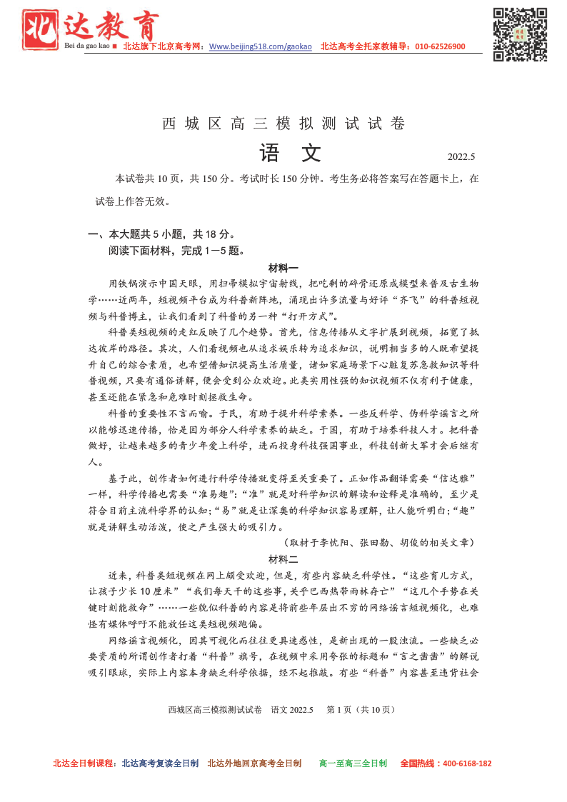首页 高三资料 北京西城区2021-2022学年高三二模语文试题