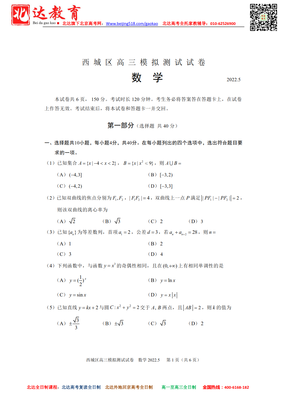 首页 高三资料 北京西城区2021-2022学年高三二模数学试题