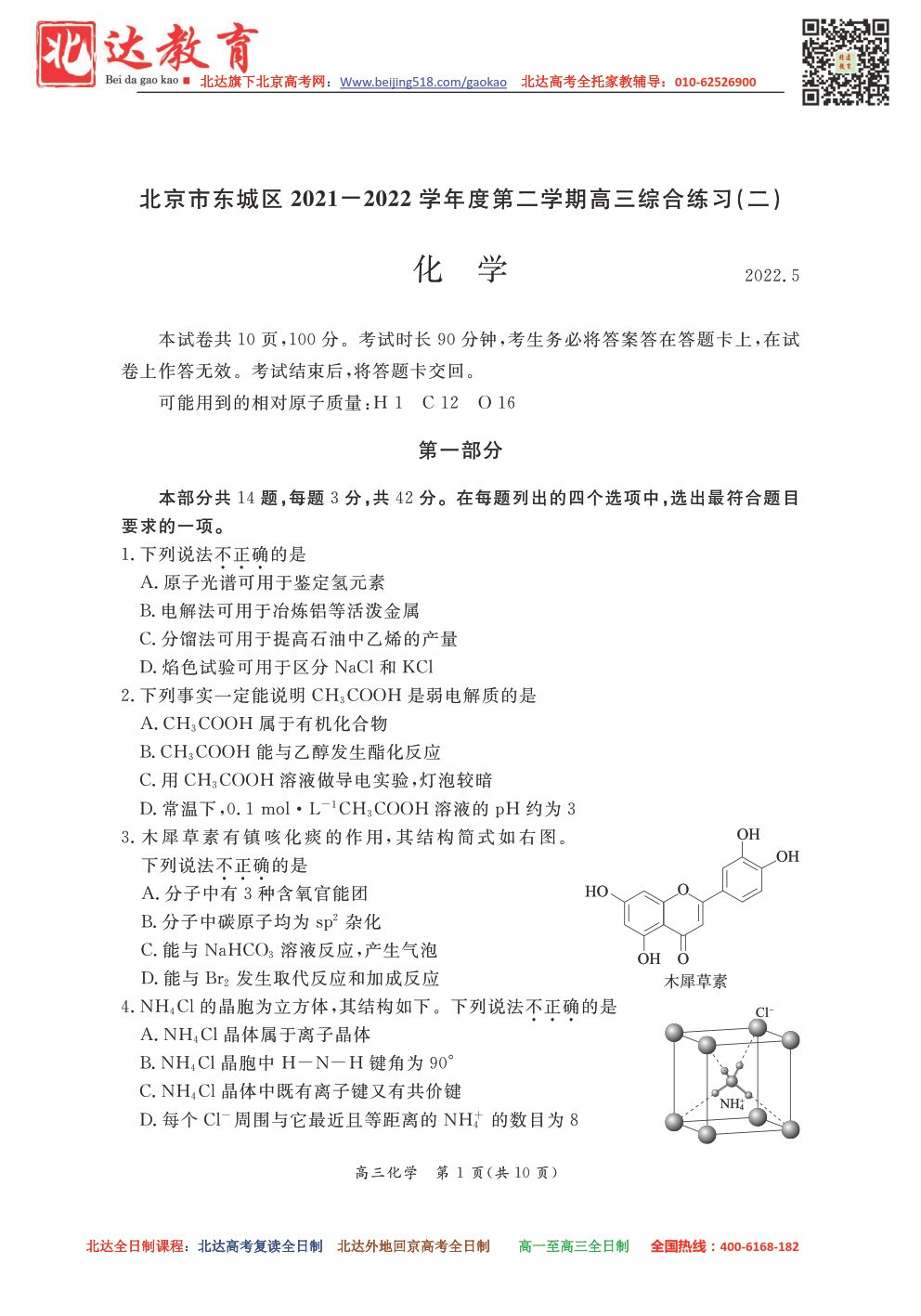 首页 高三资料 北京东城2021-2022学年高三二模化学试题