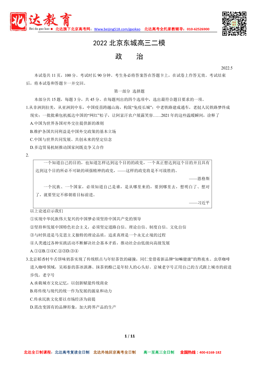 首页 高三资料 北京东城2021-2022学年高三二模政治试题及答案
