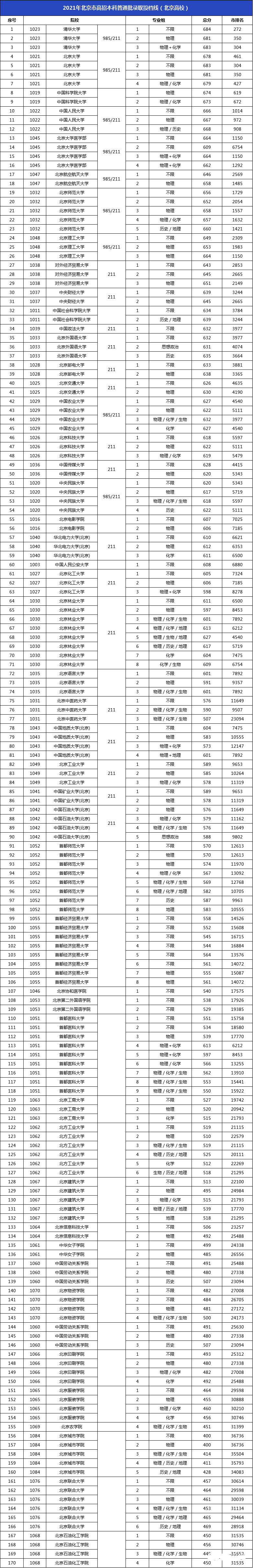 2021北京高招本科录取投档线