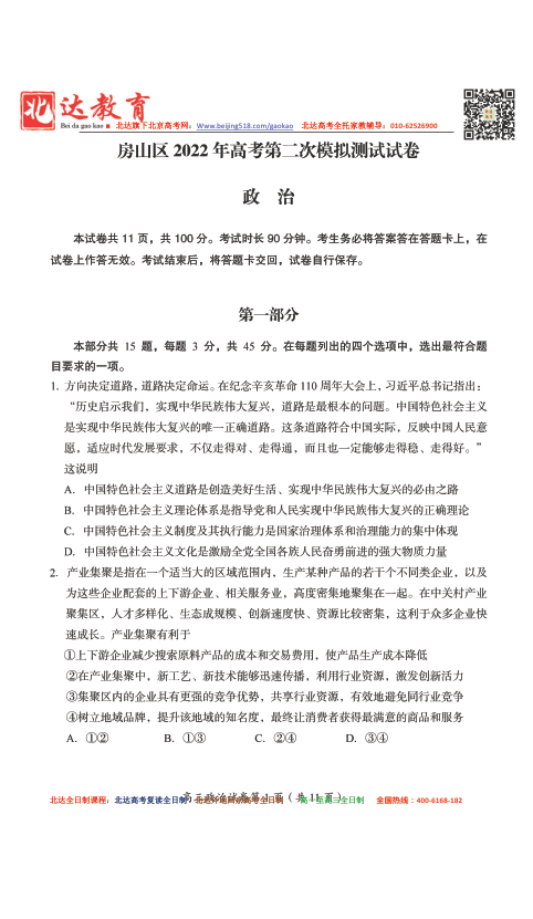 2022年北京房山区高三二模考试已开始,二模在形式和题量上更接近高考,因此同学们要格外重视,为了方便同学们下载复习,北京高考复读学校跟进相关试题,详情如下。