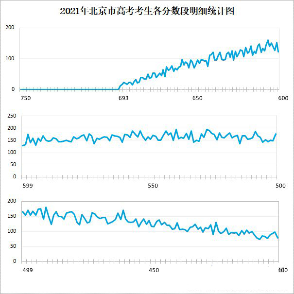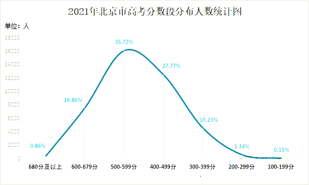 2021年北京市高考600分以上人数8015人,占总人数的17.72%,其中包含693分及以上高分的100人;500-599分占比最多,从细分的分数段可看出,此分数段一分一段人数大多数在150-200人之间波动。