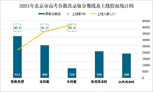 2021年北京市高考各批次录取分数线及上线情况统计图