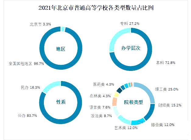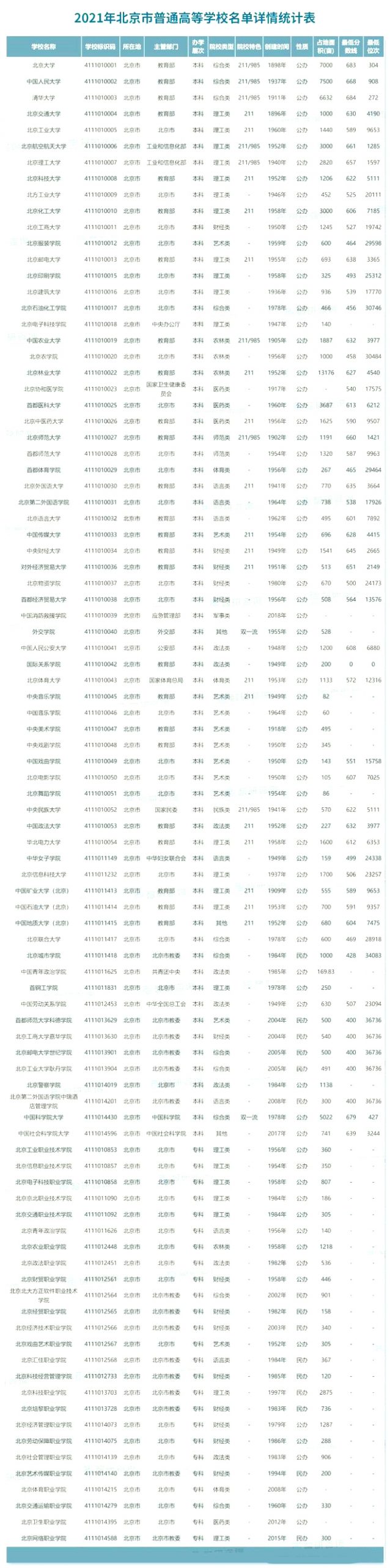 截至2021年9月30日,北京市共有92所普通高等学校,占全国普通高等学校(有2756所)比重的3.3%,其中本科67所,占北京市普通高等学校比重的72.8%,含有8所985工程院校(全国共39所985工程院校,北京数量最多),北京市普通高等学校以理工类院校居多。北京交通大学建校历史可追溯于1896年,是北京市最悠久的普通高等学校,北京林业大学占地面积13176亩,是北京92所普通高等学校中面积最大的学校。