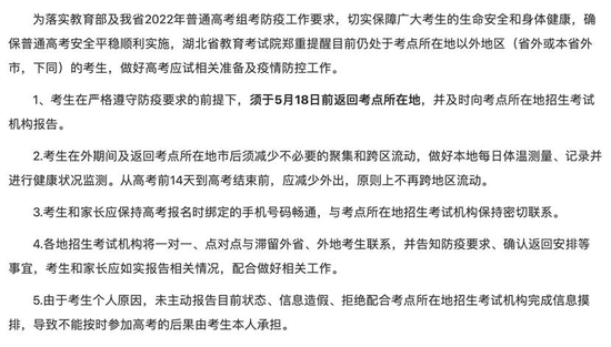 - 湖北:滞留外省、外地考生须于5月18日前返回考点所在地