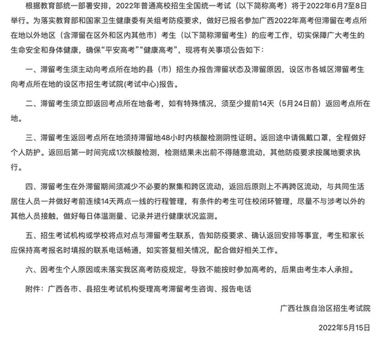 - 广西:滞留考生返回考点所在地须持滞留地48小时内核酸检测阴性证明