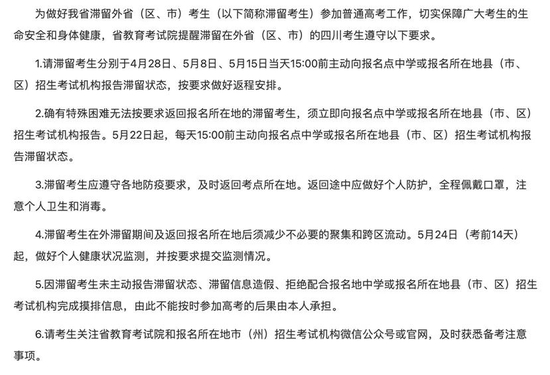- 四川:滞留在外的考生在规定时间内主动报告滞留状态