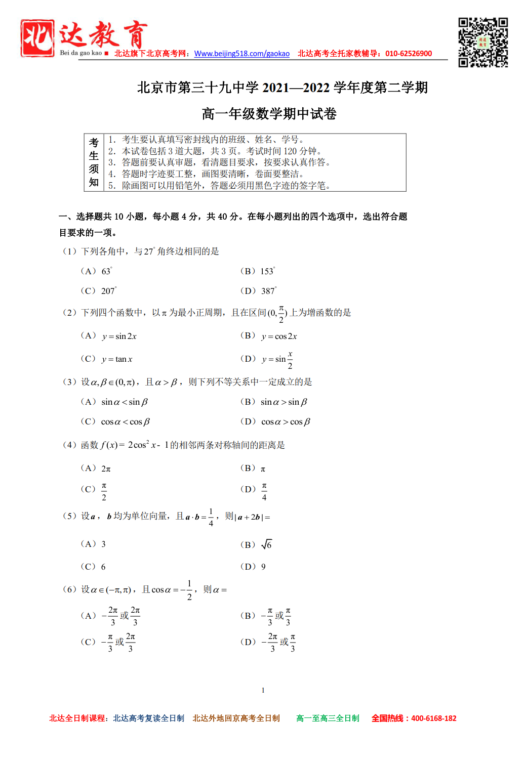 北京市第三十九中学2022年高一年级期中考试数学科目考试已结束,北京admw360教研组为大家整理了数学试题答案,分享给各位小伙伴。