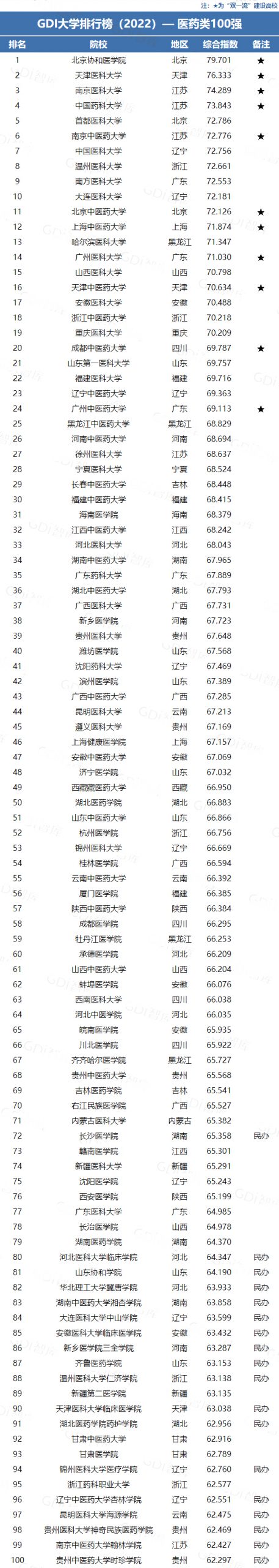 在“GDI大学排行榜(2022)— 医药类100强”中,北京协和医学院、天津医科大学、南京医科大学位居前三,中国药科大学、首都医科大学分列第四、第五。
