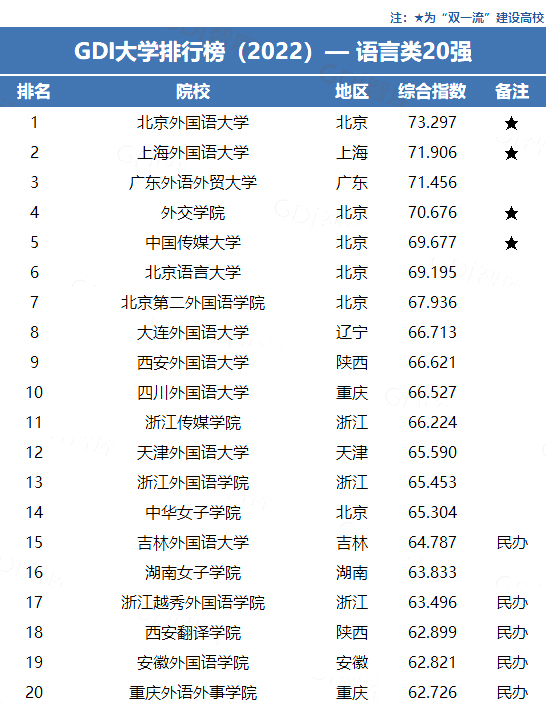GDI大学排行榜(2022)语言类20强