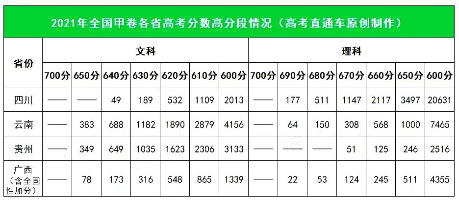 由于官方未公布700分以上考生的具体人数,我们从已知的数据可以得知:云南的高分考生人数名列前茅,650分以上的考生有383人,贵州也紧随其后,同样有超过300名文科考生分数在650分以上。理科考生的情况则有所不同,四川的高分考生最多,云南和广西也有数十人分数在690分以上。统计600分以上的考生人数总数,四川以超过2万的数量大幅超过甲卷其他三省,取得压倒性的胜利。