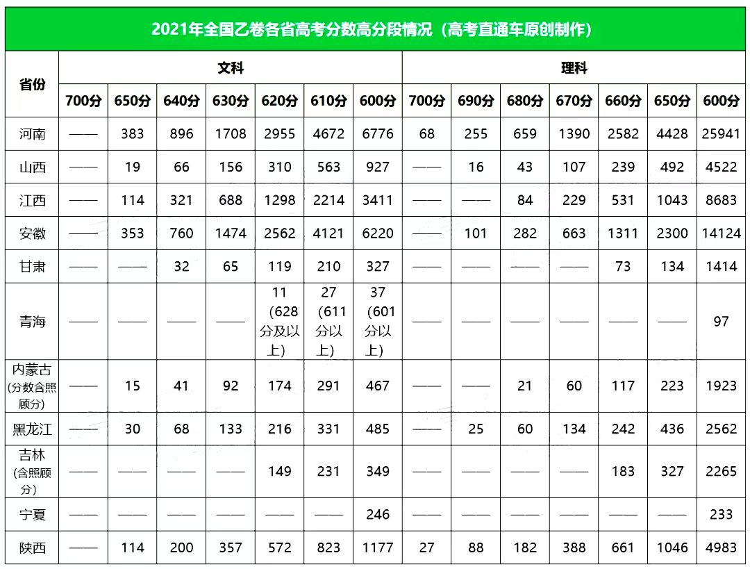 从全国乙卷来看,各省市基本没有700分以上的高分考生,各省市之间的高考成绩相差较大。从文科来看,650分以上高分考生人数河南和安徽遥遥领先,河南和安徽分别以383人和353人650分以上的成绩居于全国乙卷地区前两位。而青海、吉林、宁夏表现则稍微逊色,从官方发布的分段表来看,青海只有11位考生文科分数在628分以上。