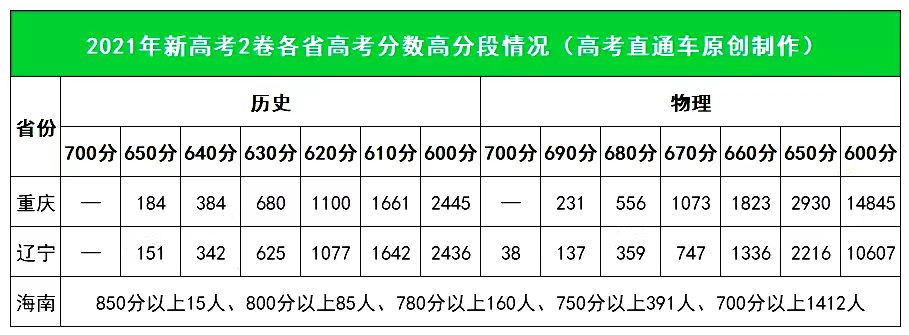 重庆、辽宁的历史类高分段人数情况十分接近,均有超过2400人的高考成绩达到了600分以上。物理类考生中,辽宁的高分考生较多,有38人在700分以上,重庆的高分考生更集中于600-680分的区间内。海南和重庆、辽宁的高考总分不同,今年共有15人在850分以上,700分以上的考生共有1412人。