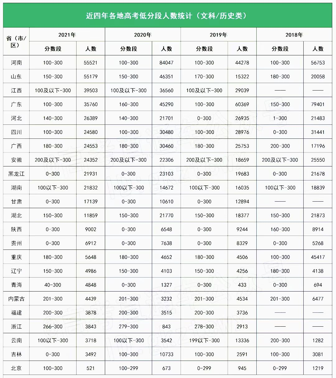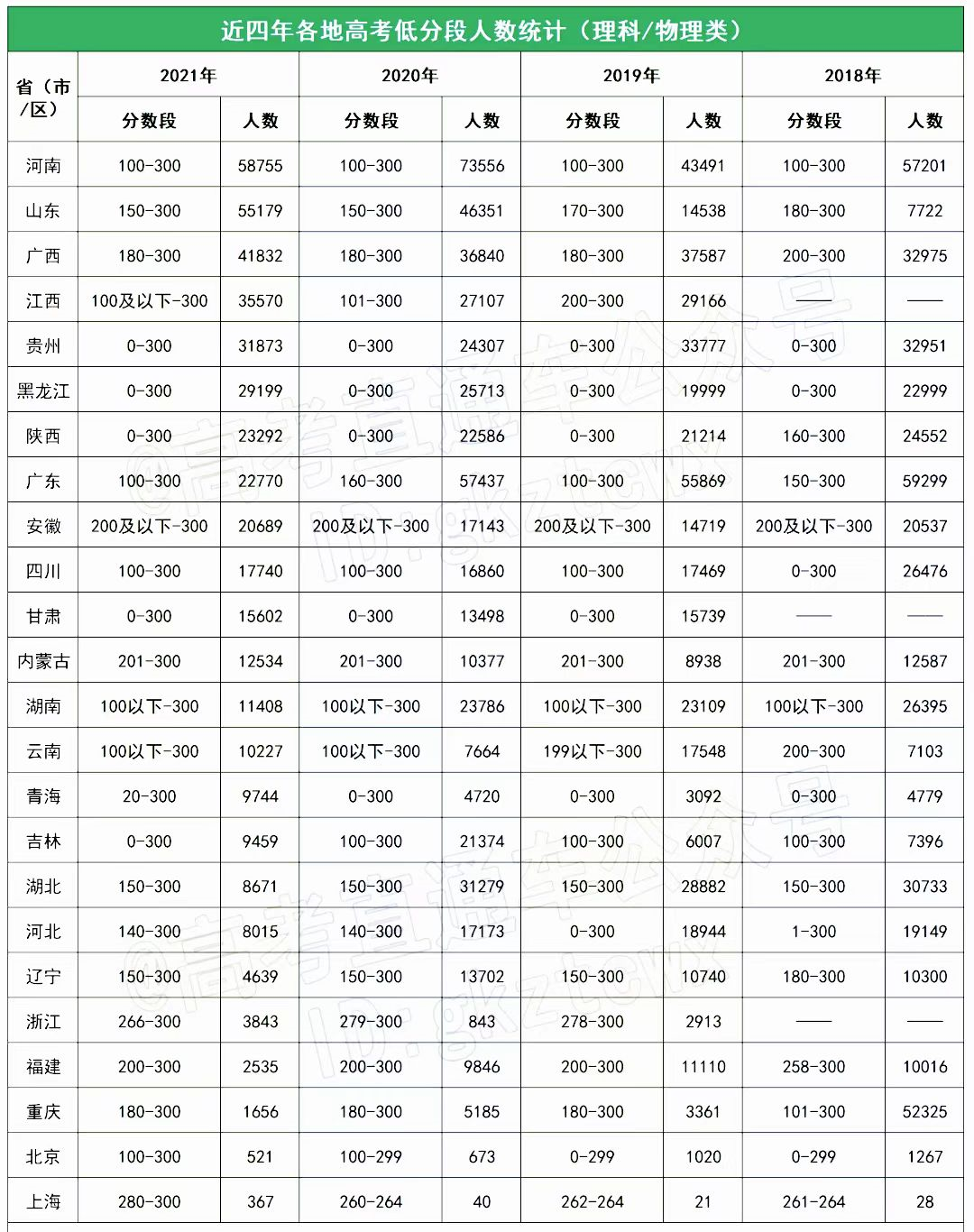①可以看到,300分以下的低分段人数最多的省份是河南省,人数高达5万5!虽然对比去年的8.4万人下降明显,但是也是一个难以忽视的数字。其次是山东省,300分以下的人数也超过5.5万人。值得注意的是,不管是2020年还是2021年,河南、山东的低分段人数都在前二。这不仅跟当地的教育资源和水平有关,主要还是受高考人数影响。我们都知道,河南和山东都是有名的高考大省,特别是河南,每年的高考人数都在百万上下,所以低分段人数最多也不足为奇。