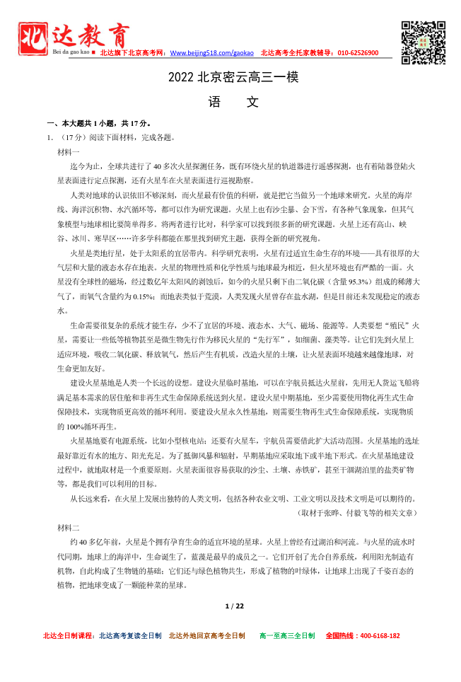 根据安排,3月28日-30日,2022年北京密云区举行高三一模考试,一模在形式和题量上更接近高考,因此同学们要格外重视,为了方便同学们下载复习,北京高考复读学校跟进相关试题,详情如下。