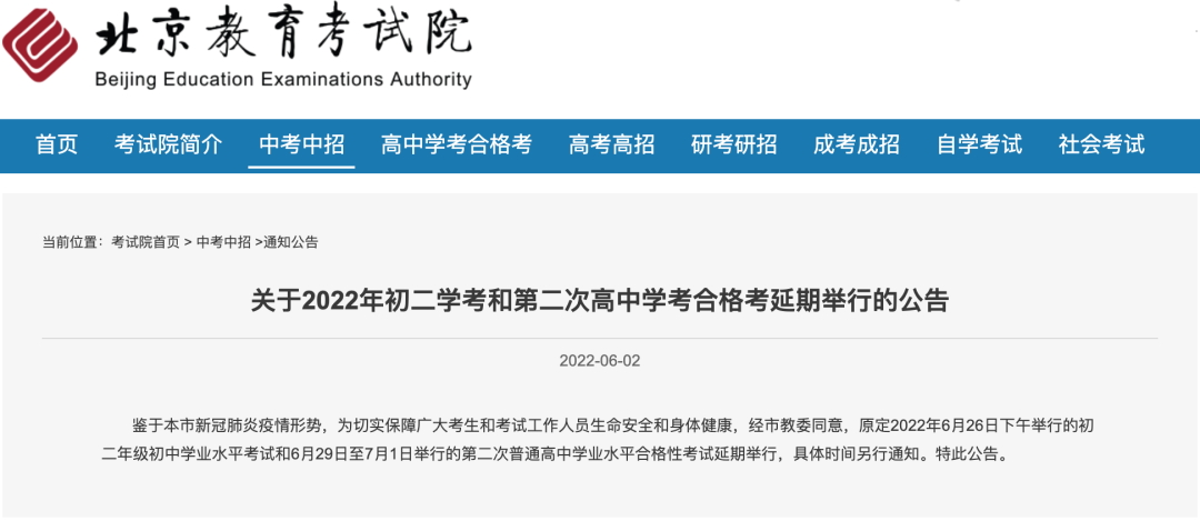 鉴于本市新冠肺炎疫情形势,为切实保障广大考生和考试工作人员生命安全和身体健康,经北京市教委同意,原定2022年6月26日下午举行的初二年级初中学业水平考试和6月29日至7月1日举行的第二次普通高中学业水平合格性考试延期举行,具体时间另行通知。