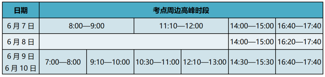 结合往年情况,开考前一小时和散场前后,考点周边道路车流集中,通行压力较大。结合今年考试时间安排: