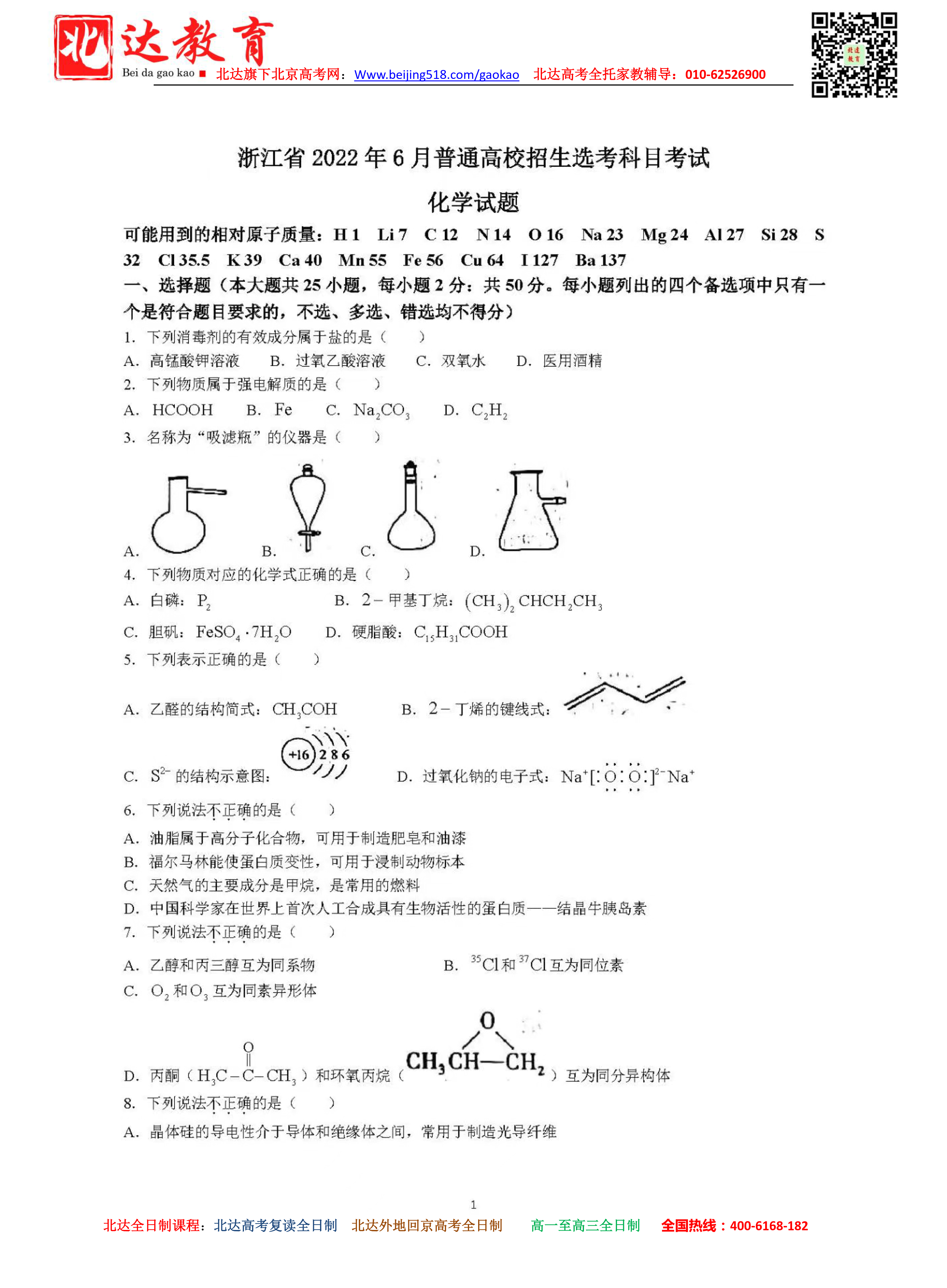 北京admw360教研组为大家整理了2022年高考(浙江卷)化学试题及答案解析,希望对大家有所帮助。