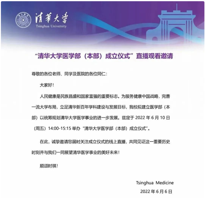 6月6日,清华大学发布消息称,为服务健康中国战略,完善一流大学布局,立足清华新百年学科建设与发展目标,清华大学拟建立医学部(本部),并将于6月10日(周五)举办仪式,以统筹规划清华大学医学事业的进一步发展。以下为内容详情: