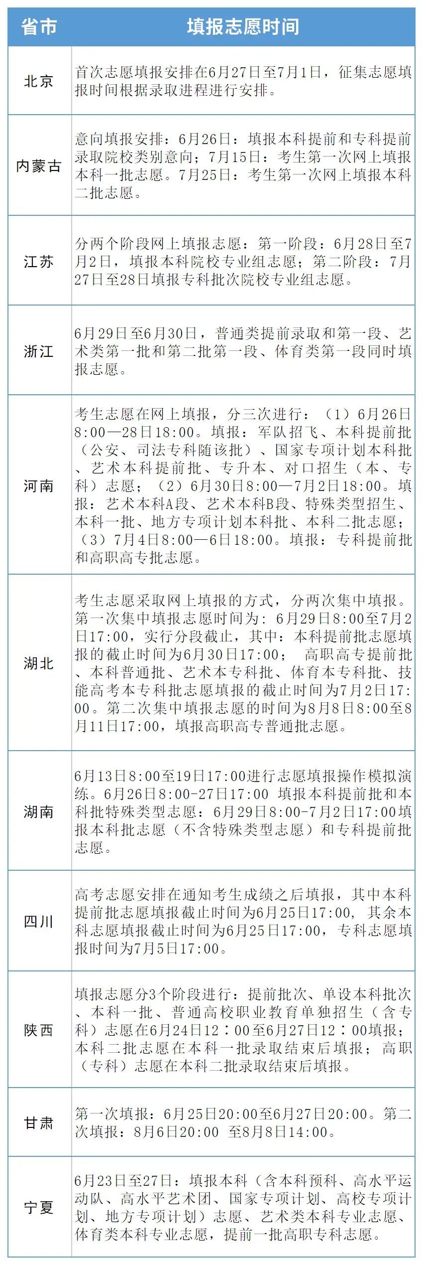 北京、内蒙古、江苏、浙江、河南、湖北、湖南、四川、陕西、甘肃、宁夏等省市在早前公布了志愿填报时间/预计志愿填报时间。