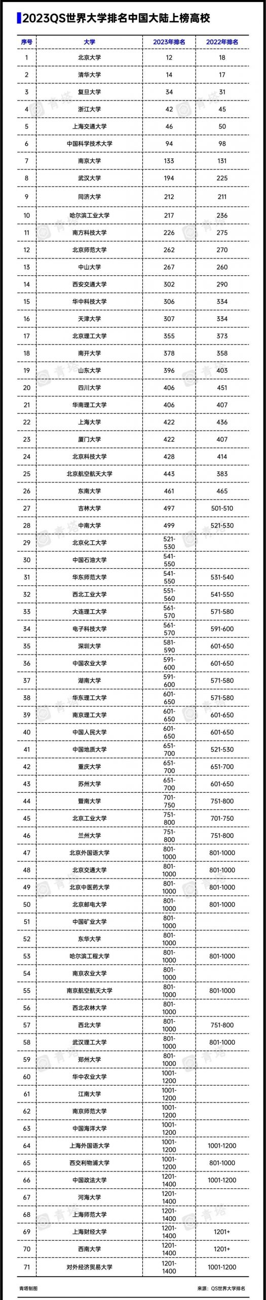 今年的QS世界大学排行榜共有71所中国内地高校上榜,上榜高校数为世界第三,仅次于美国(201所)和英国(90所)。