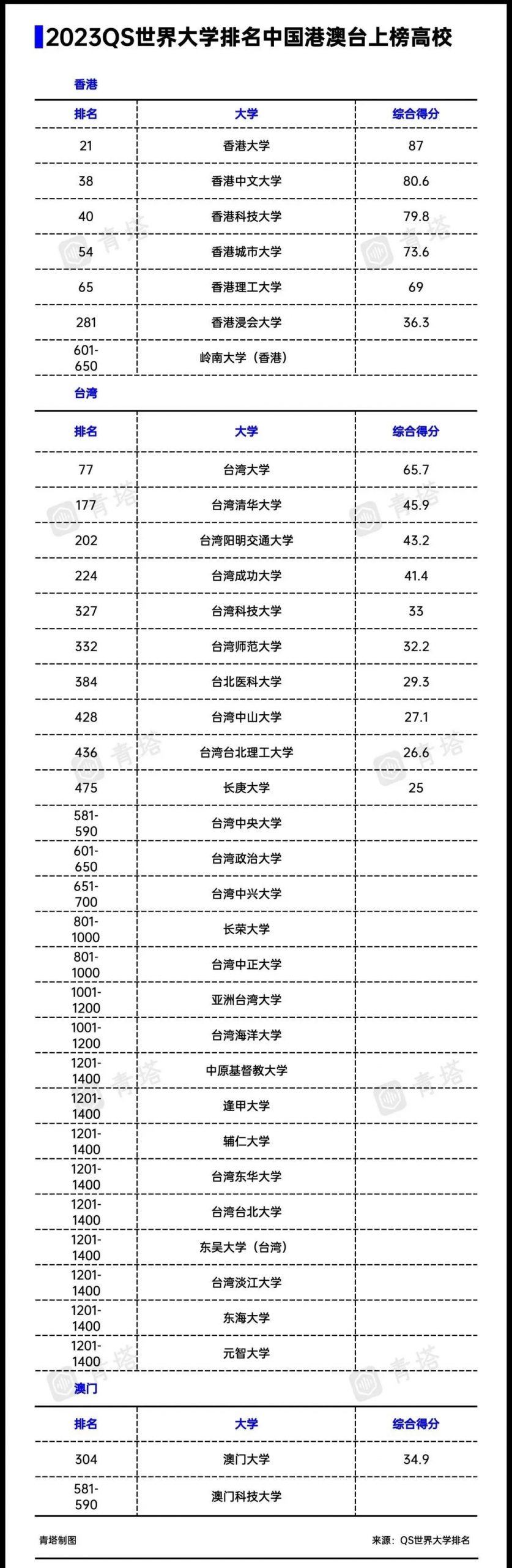 中国港澳台地区高校中,香港大学位居全球第21名,为香港高校首位;中国台湾地区排名最高的是台湾大学,全球排名77位;澳门大学位居全球304位。