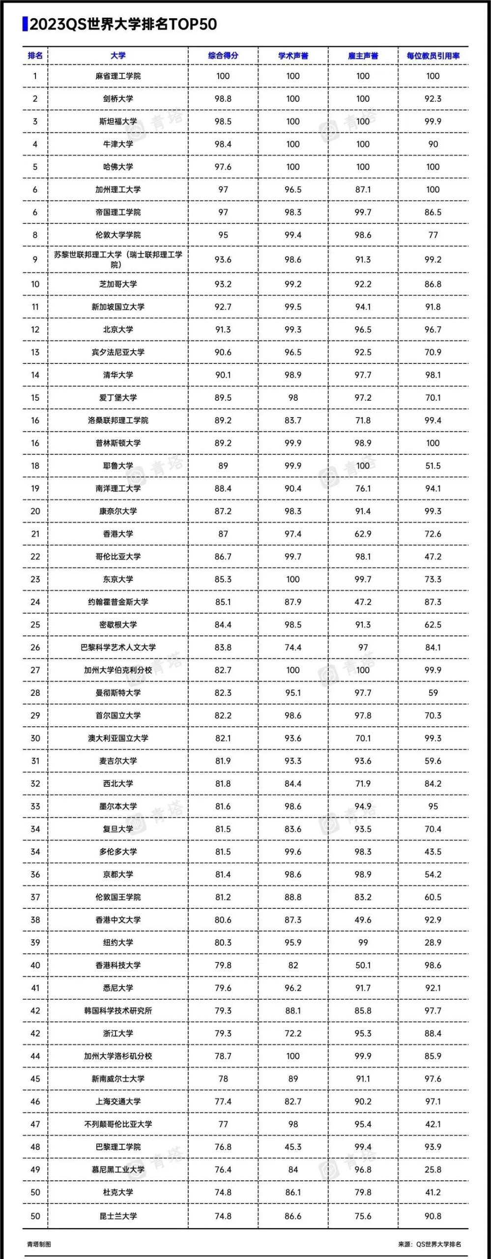 QS 2023年世界大学排名TOP50 高校名单如下: