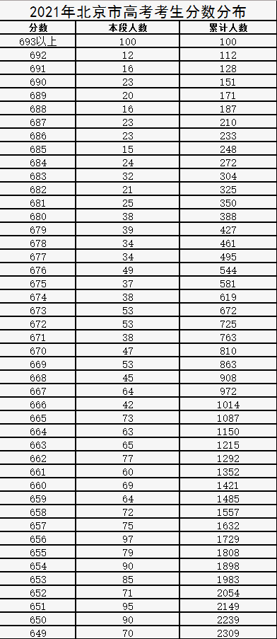 2021年北京高考一分一段市排名