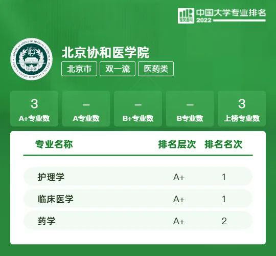 一部中国医学史,半部尽数在协和。北京协和医学院,医学科学与教育事业实力行业领衔,开创了我国八年制医学教育、高等护理教育、住院医师培训制度和最早的公共卫生实践,在国内率先实施“4+4”临床医学教育模式、开创卓越护理人才贯通培养改革试验班,医学教育实践硕果累累。本次排名中纳入协和的专业——护理学和临床医学,以及2015年备案开设的药学专业,成绩全部在A+之列,其中护理学与临床医学专业全国第一,在人才培养与专业建设方面,实属行业头魁,难出其右。