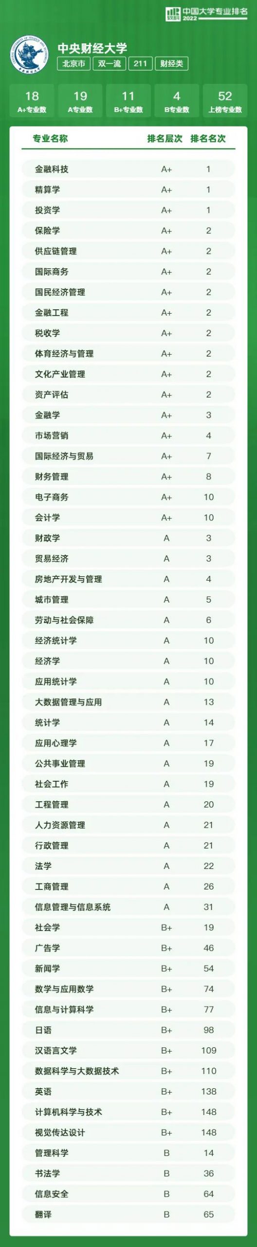 此外,以中央财经大学为代表的财经领域高校专业实力同样突出。中央财经大学堪称“财经黄埔”,是“中国财经管理专家的摇篮”,本次排名中有18个专业位列A+,投资学、精算学、金融科技位列全国第一。中央财经大学入选国家首批基础学科拔尖学生培养计划2.0基地、国家卓越法治人才教育培养计划,拥有国家级教学团队5个和北京市优秀教学团队7个,其中2个团队分别入选首批和第二批“全国高校黄大年式教师团队,更有诺贝尔经济学奖获得者约瑟夫·斯蒂格利茨、国际著名经济学家约翰·威廉姆森等为荣誉教授。此外,上海财经大学、对外经济贸易大学亦在单科性大学A+专业精度中表现优异。