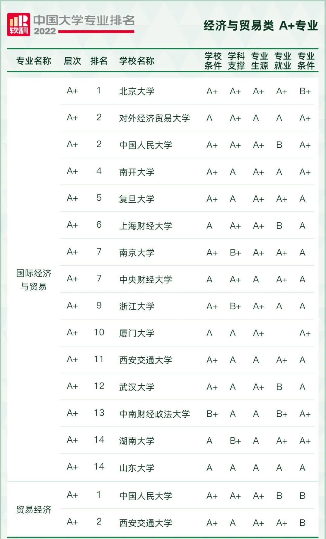 经济与贸易类专业A+院校2022年排名发布