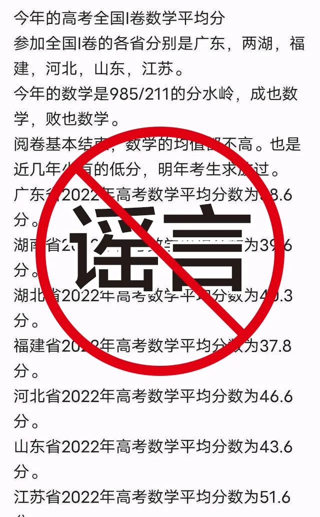 近日,有自媒体“抢先”发布福建、江苏、广东等地高考数学成绩平均分,并称“阅卷基本结束,数学的均值都不高,也是近几年少有的低分”。对此,江苏、福建、广东等多省辟谣,上述信息为假消息,他们从未公布各科平均分。以下为内容详情,一起来看。