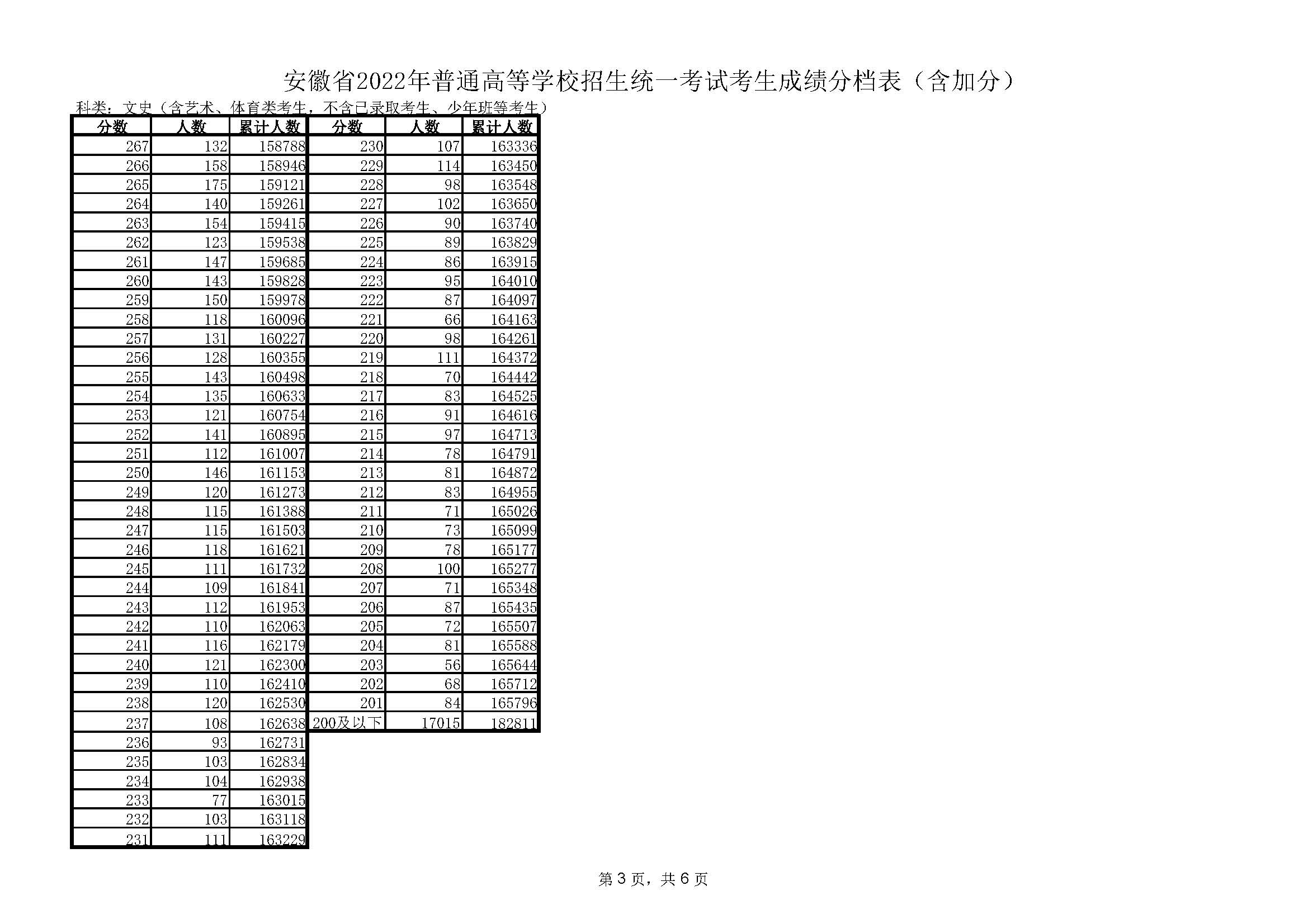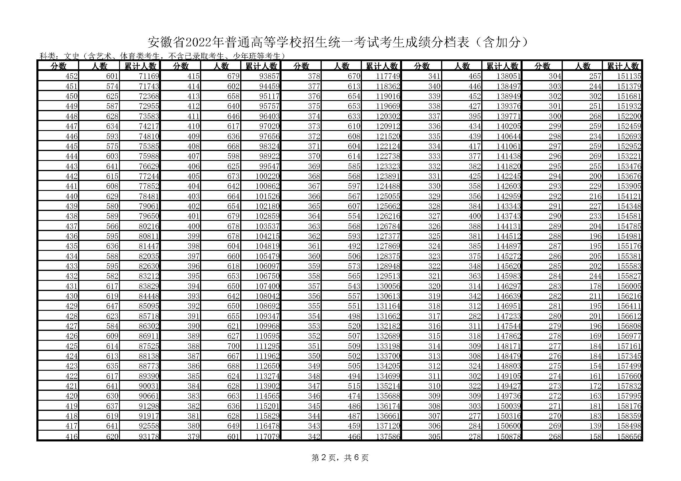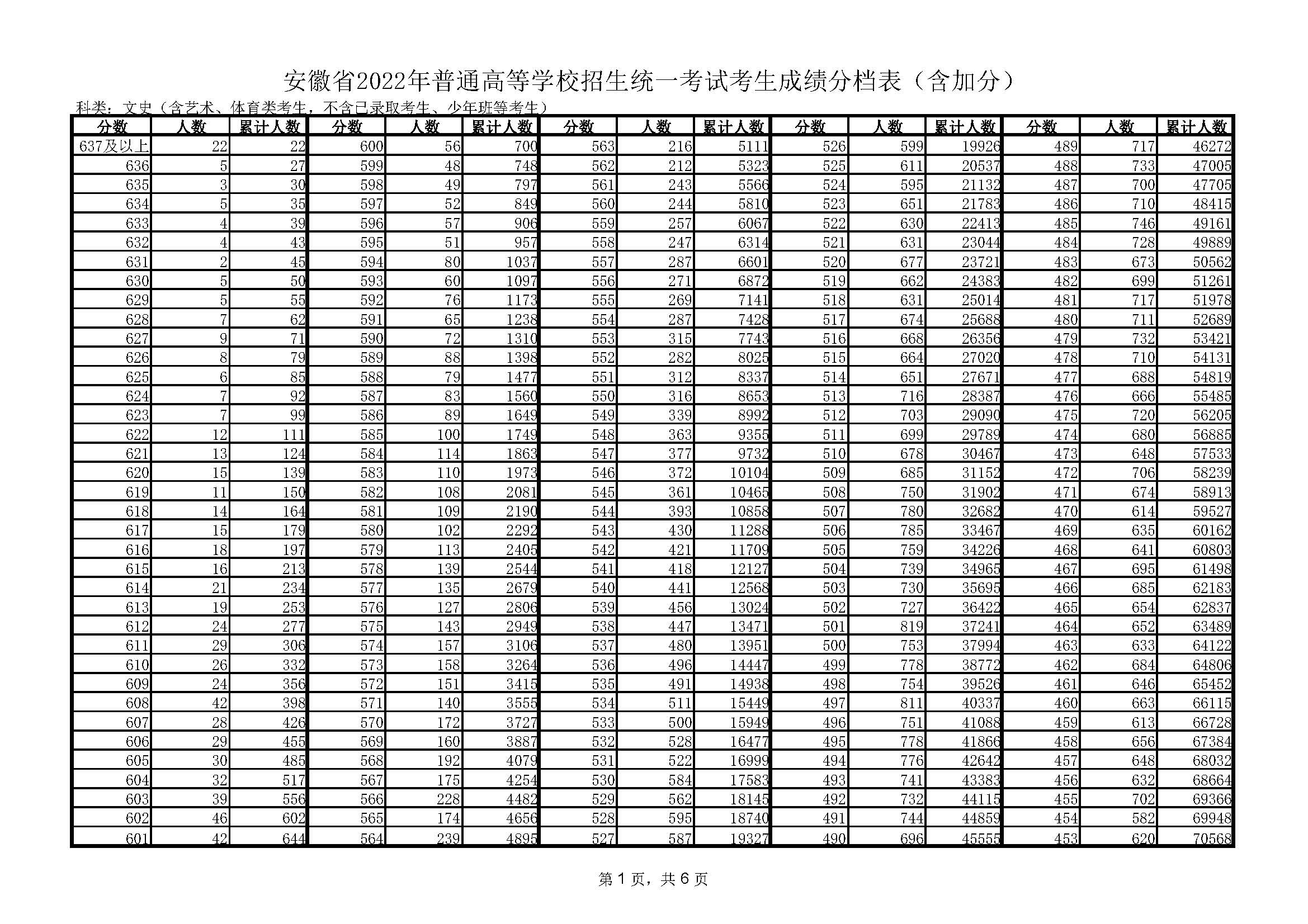 2022年安徽高考文科成绩一分一段表
