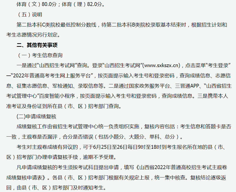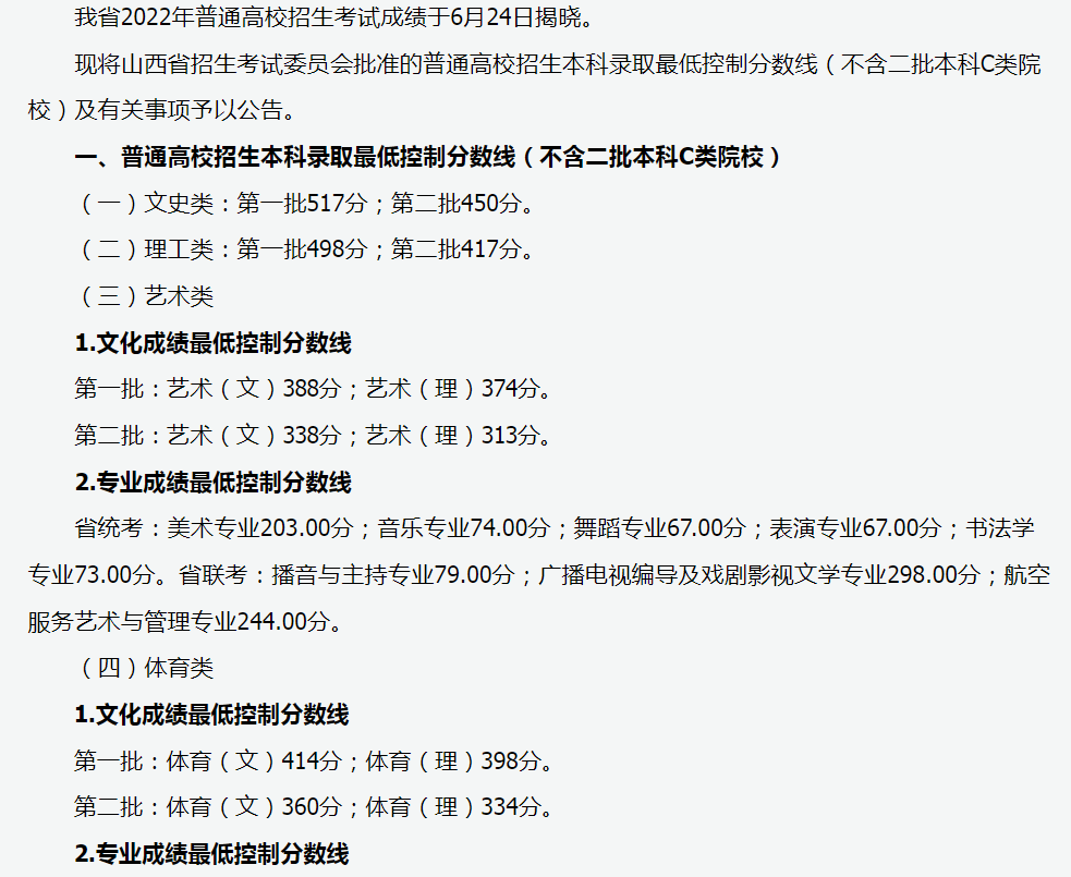 2022山西普通高等学校招生录取最低控制分数线