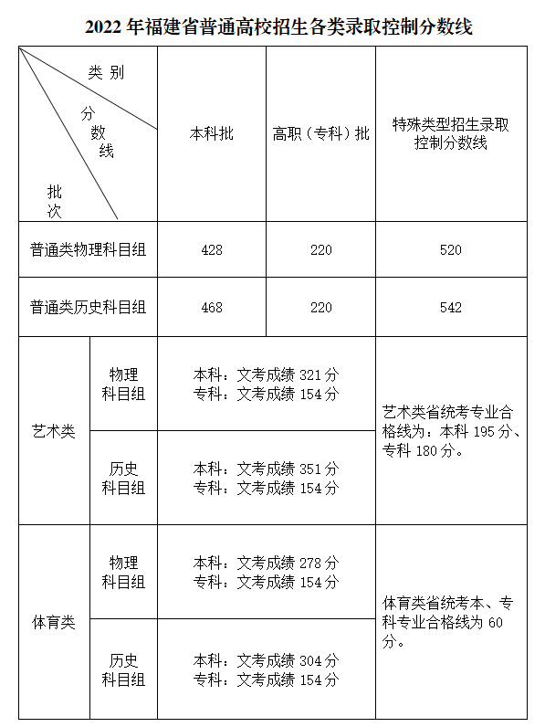 6月24日下午,福建省高等学校招生委员会召开2022年第二次全体会议,研究确定今年我省高考切线方案,部署高招录取工作。经会议研究决定,2022年福建省普通高校招生各类录取控制分数线具体如下: