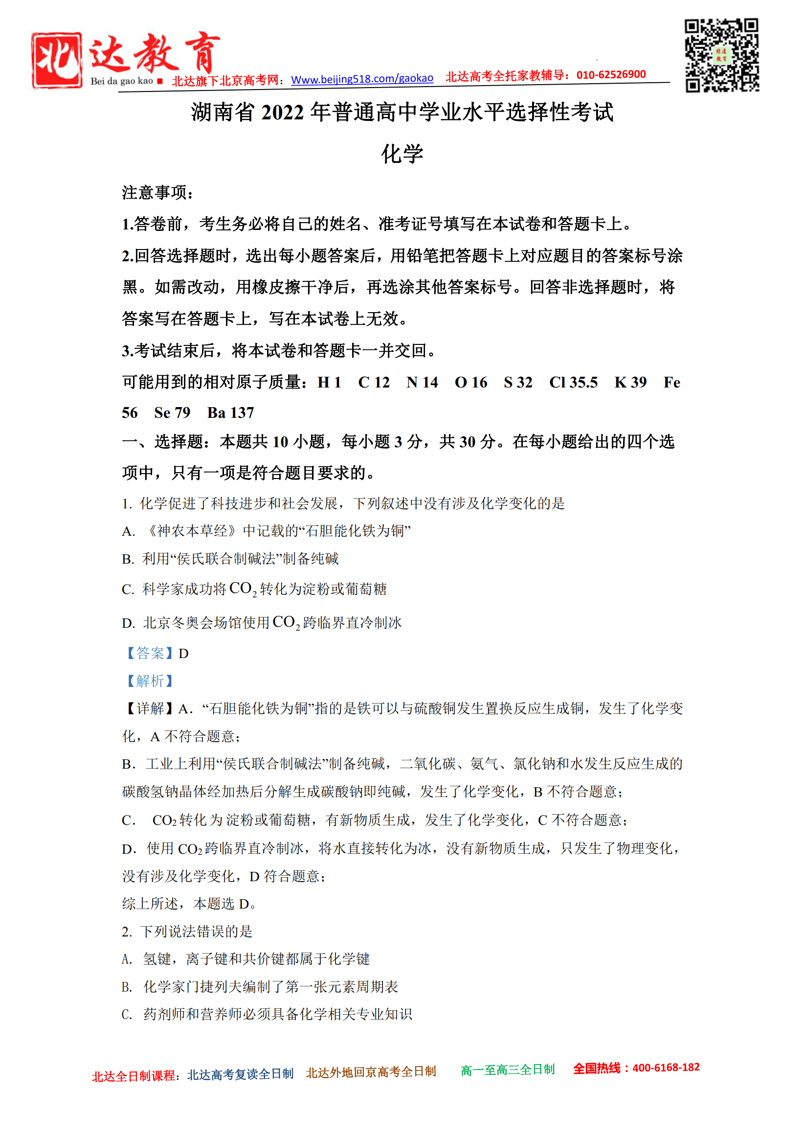 北京admw360教研组为大家整理了2022年全国1卷(湖南卷)化学试题及答案,希望对大家有所帮助。