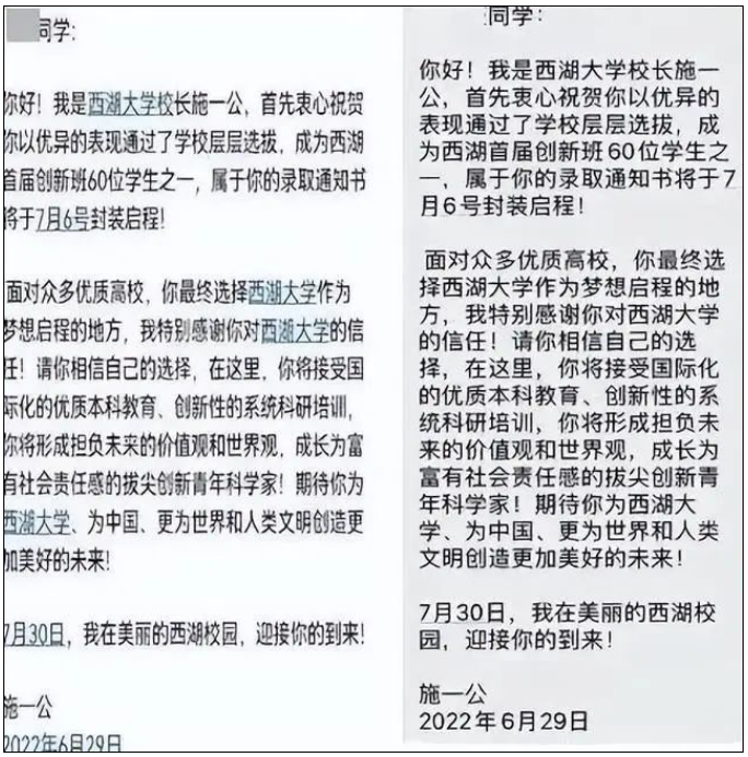 近日,西湖大学2022年本科生创新班拟录取结果正式公布,有60位幸运考生已经提前拿到了心仪院校的入场券,一条来自西湖大学校长施一公的录取短信如下: