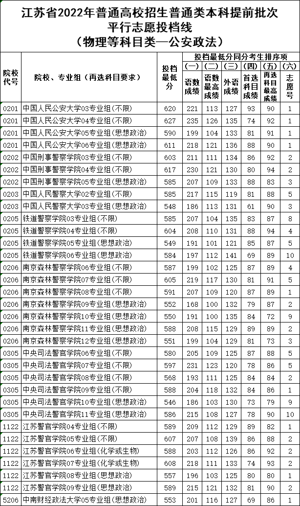 2022江苏高考普通类本科提前批次投档线(公安政法)—物理组