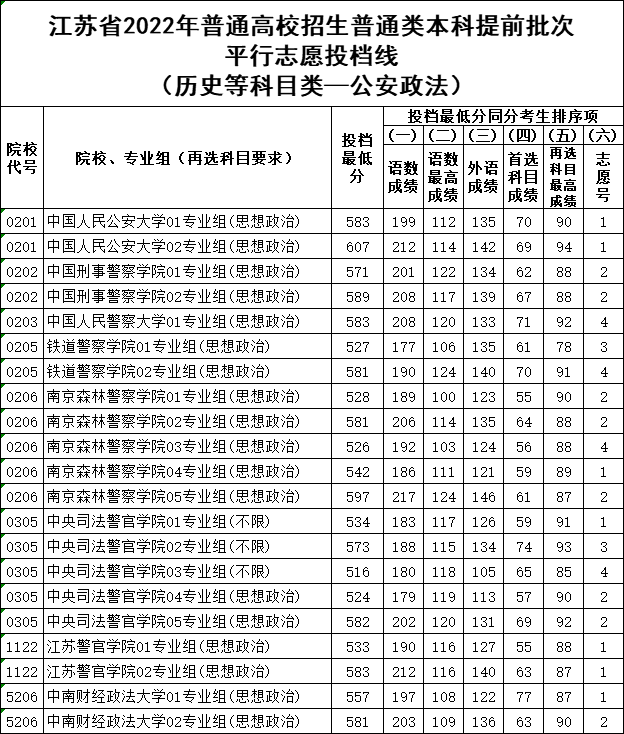 2022江苏高考普通类本科提前批次投档线(公安政法)—历史组