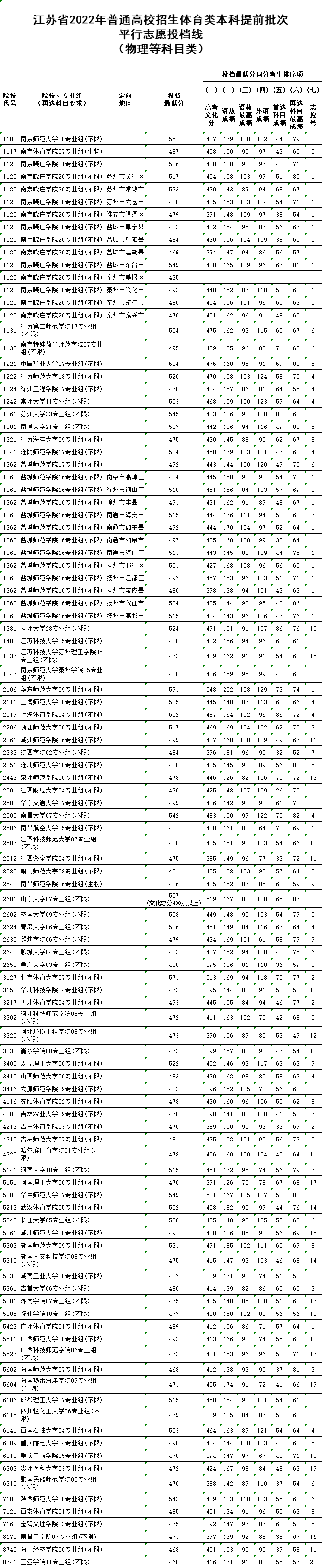 2022江苏高考普通类本科提前批次体育类平行志愿投档线—物理组