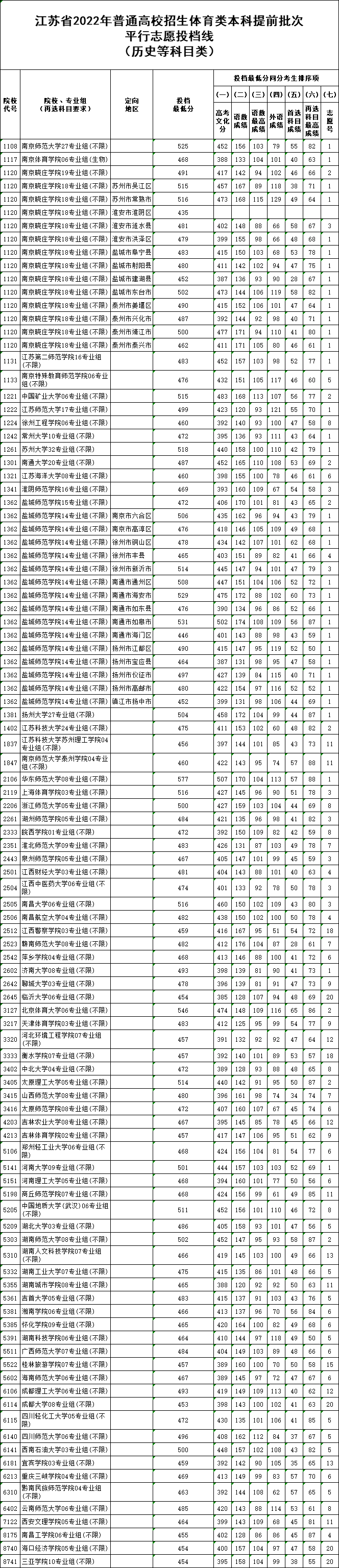 2022江苏高考普通类本科提前批次体育类平行志愿投档线—历史组