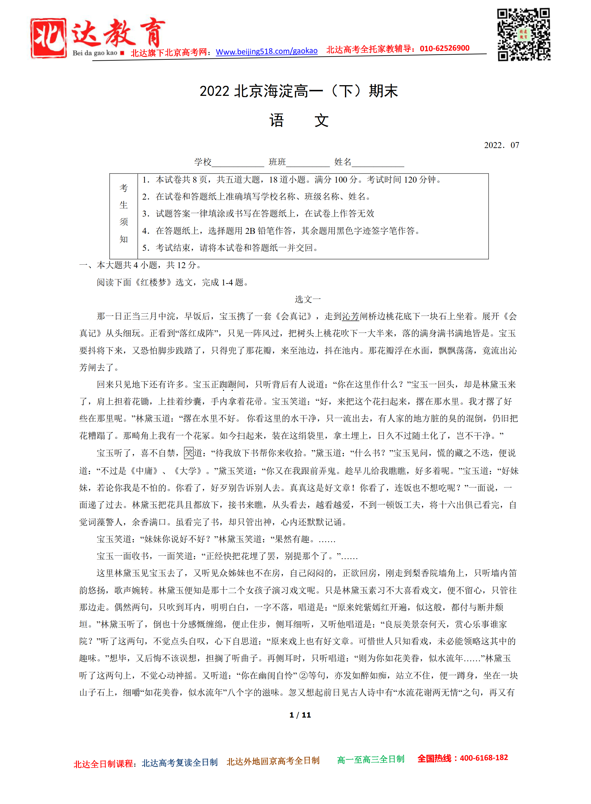 近日,北京admw360教研组为大家整理了2021-2022年北京海淀区高一下学期期末考试语文试题及解析,需要的小伙伴赶紧下载吧。