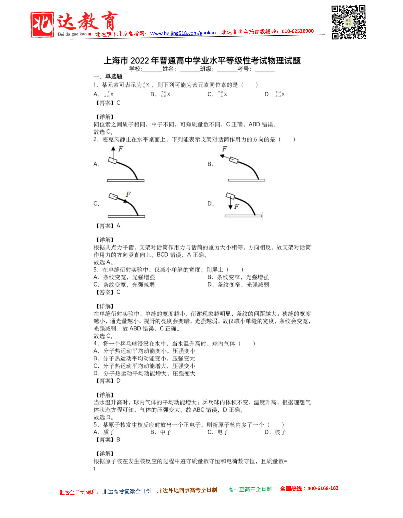 北京admw360教研组为大家整理了2022年高考(上海卷)物理试题及答案解析,希望对大家有所帮助。