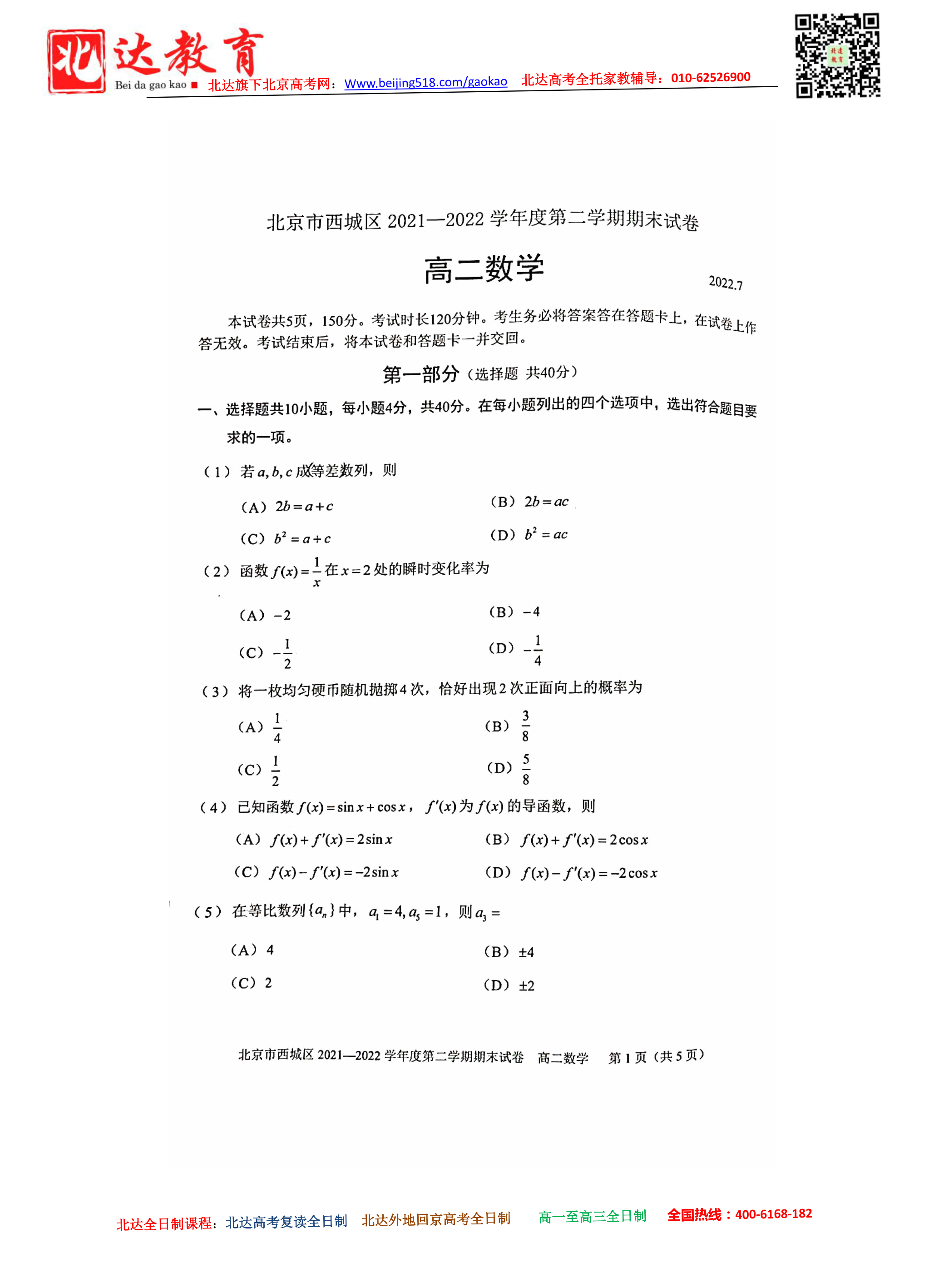 近日,北京admw360教研组为大家整理了2022年北京西城区高二下学期期末考试数学试题
