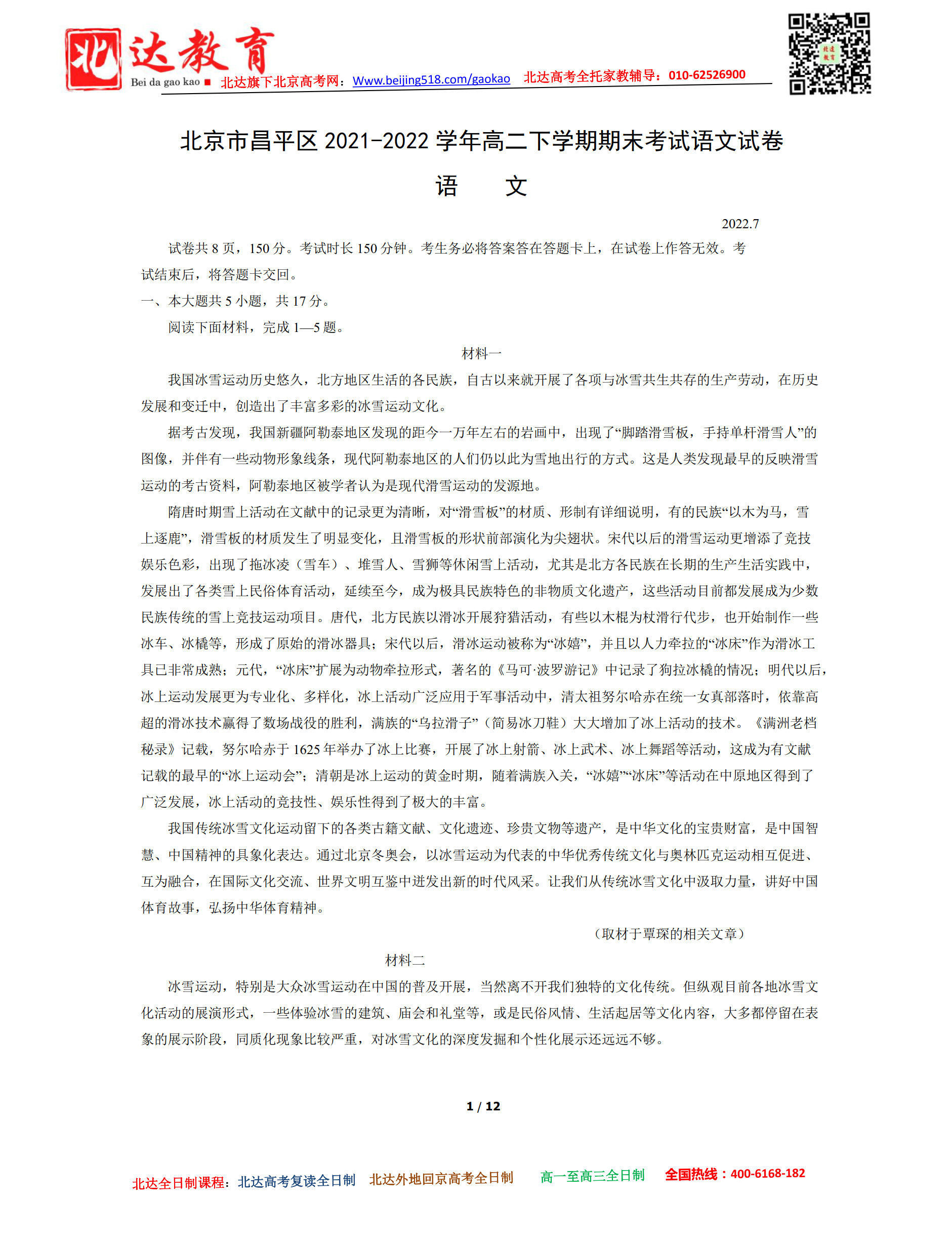 近日,北京admw360教研组为大家整理了2021-2022学年北京昌平区高二下学期期末考试语文试题及答案,需要的小伙伴赶紧下载吧。